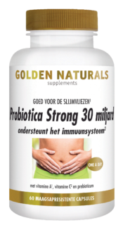 Golden Naturals Probiotica 30 miljard is een maagsapresistente one-a-day capsule met vitamine C dat het immuunsysteem ondersteunt. Daarnaast bevat het Lactobacillus Rhamnosus, Lactobacillus Casei, Bifidobacterium Animalis subsp. Lactis, FOS.