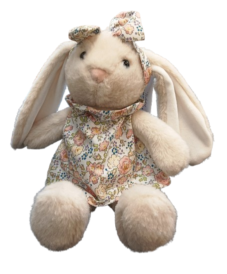 Dit konijntje is feestelijk en kleurrijk in het schattige bloemenjurkje.