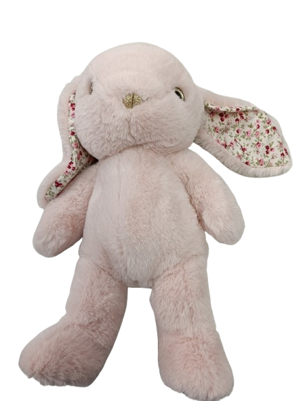 Het konijn Flora van Teddykompaniet heeft een zachte en knuffelige vacht in een mooie roze kleur. Ze heeft een decoratieve bloemenstof aan de onderkant van haar oren en poten, grote sprankelende ogen en een mooie glanzende neus.
